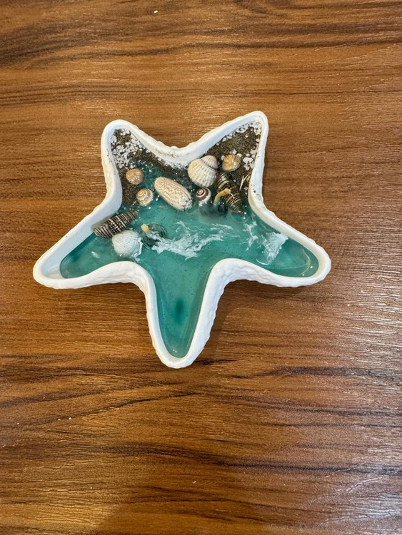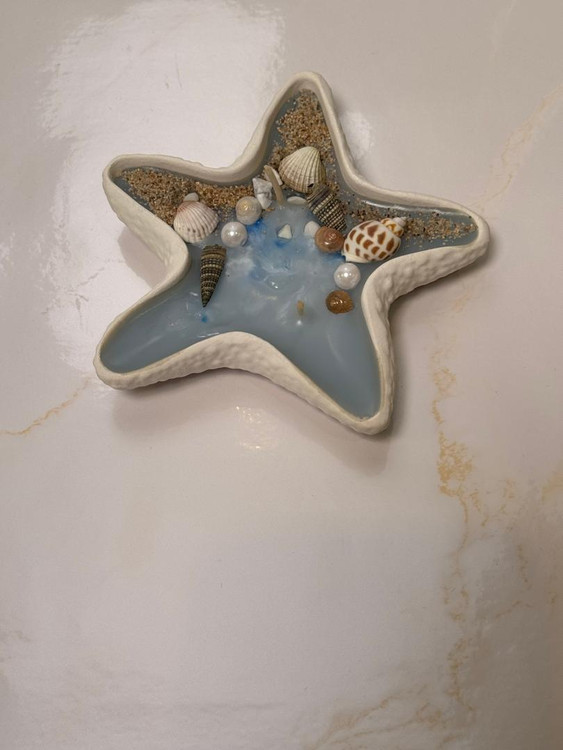 ترکیب ستاره ی سنگی و پارافین ژله ای و ی رنگ خاص و زیبا و تزیینات زیبای صدف و شن و مروارید ی هدیه قشنگ و خاص